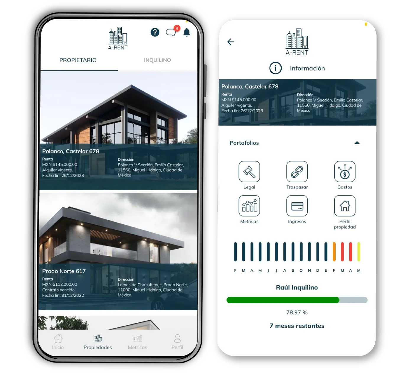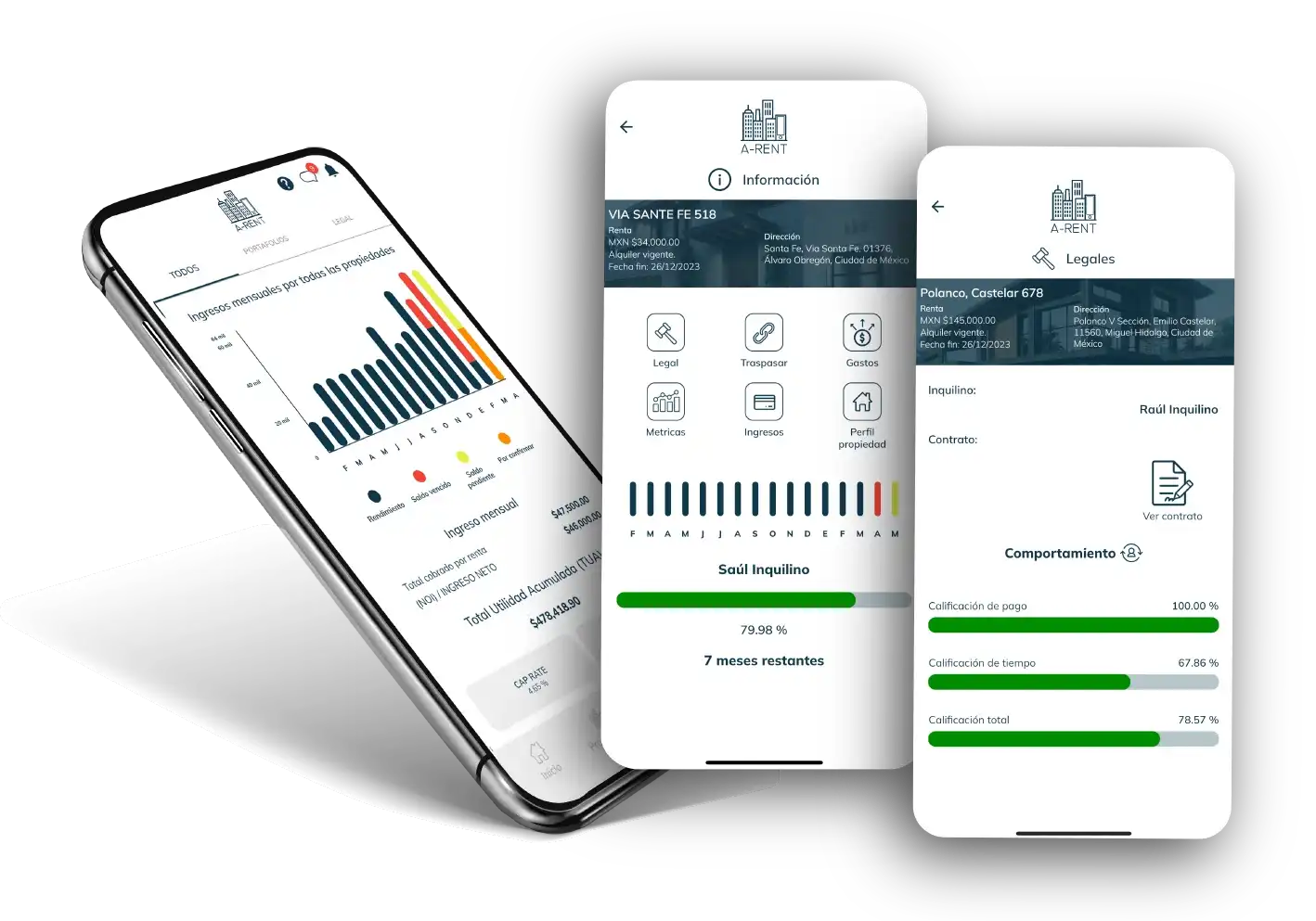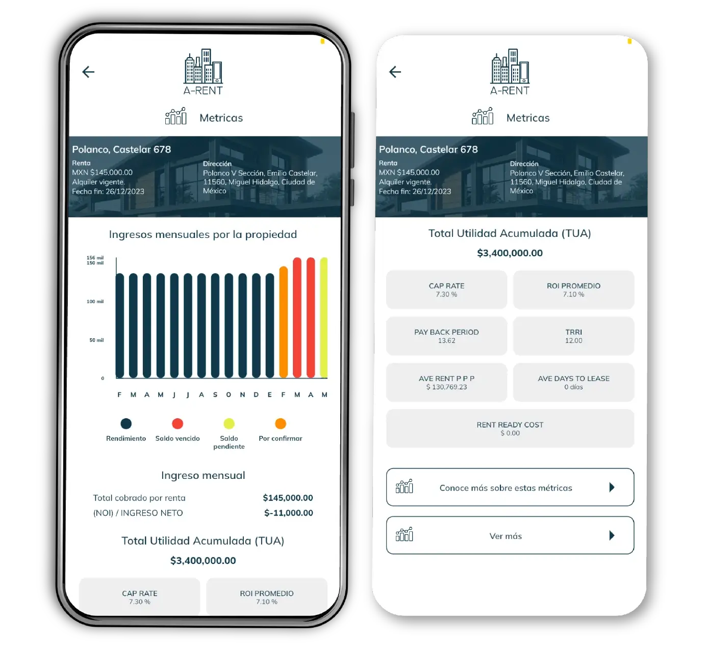 A-RENT también evalúa el desempeño financiero de todas las propiedades y presenta la información de una manera clara y fácil de entender para que los arrendadores puedan observar con claridad las áreas de oportunidad de cada inmueble y puedan maximizar cada beneficio para lograr que las propiedades produzcan mejores rendimientos económicos.